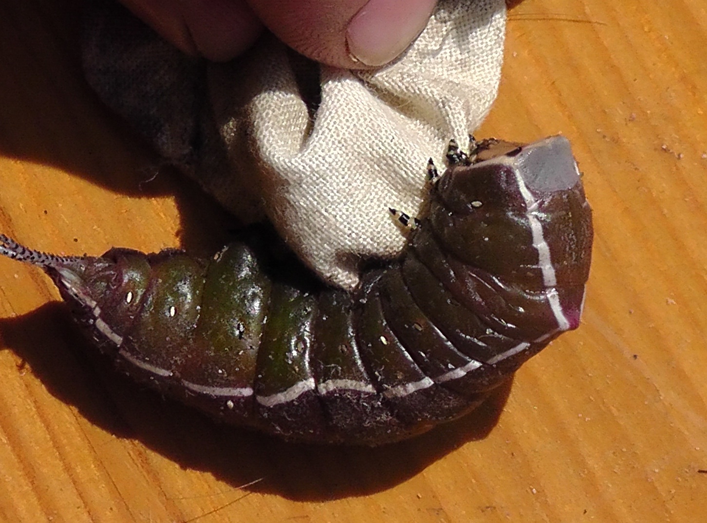 Живем в Тюмени, сегодня (в гараже!) поймали странную гусеницу, у нее квадратная морда, из которой выдвигается круглая, куча цепких ножек и раздвоеные усы на хвосте. Данный представитель живой природы сейчас жив и находится в банке.