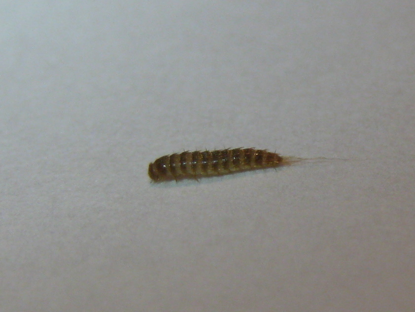 Насекомое, длинной около 4 мм. В форме червячка или многоножки, видимо личинка. Имеются ножки возможно только в передней части туловища (кажется 3 пары). По бокам волосинки, сзади - длинные волосинки (хвост). Сверху полосатое (возможно 12 полосок), брюшко белого\кремового цвета. Голова темная.