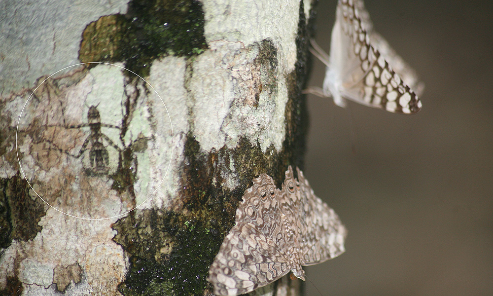 Фотографировал на дереве бабочек-"хлопушек" Hamadryas Amphichloe и так был увлечён самими бабочками, что совершенно не заметил рядом соседа (обведён кружком). Увидел его только на фотографиях. Т.к. глубина резкости была небольшая, то он не очень хорошо получился.
