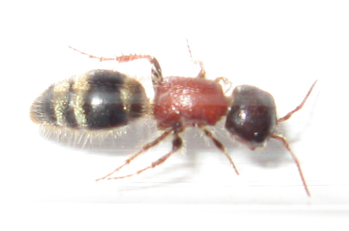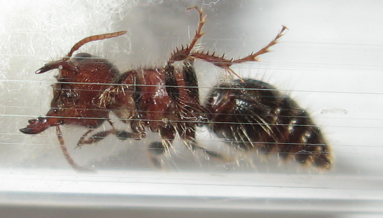 Поймал в Крыму, 25 апреля, похожа то ли на осу, то ли на странного муравья, крыльев нет, в длину около 1 см. Быстро бегает. Мощные жвалы, но когда сложены заметить трудно - полностью прячутся под голову.