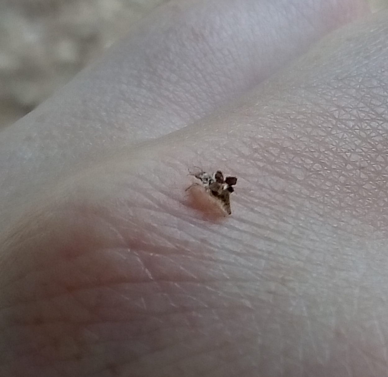 Крохотный товарищ, сам прозрачный, на спине как будто "цветочек" - он или мимикрирует под березовое семечко или это недоразвитые крылья. Челюсти как у муравья