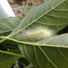 Нашли на улице гусеницу, на кленовых листах, см 1,5-2 в длину, сзади пучок коричневых волосков, когда ползла, между сегментами впереди были черные полоски, когда лежит просто зеленая, и ножки у нее мощнее чем у других гусениц как мне показалось, есть еще видео как она ползет. Кто это?