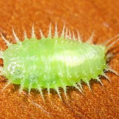 Нашел эту шестилапую гусеницу, или цикаду, или еще, не знаю что, в шелковице. Размером до сантиметра. Чтобы перевернутся со спины на брюхо, выгибается телом.
